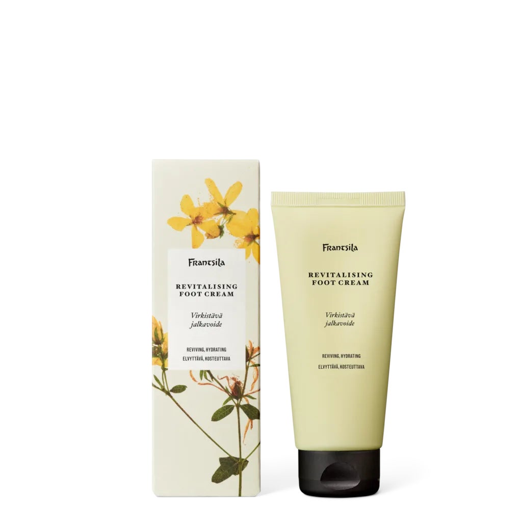 ehokkaasti hoitava ja kosteuttava virkistävä jalkavoide on täynnä luonnon tehoaineita: turvotusta poistavia luomuyrttiuutoksia, ravitsevia manteli- ja jojobaöljyjä sekä jalkoja virkistäviä aromaterapeuttisia eteerisiä öljyjä.