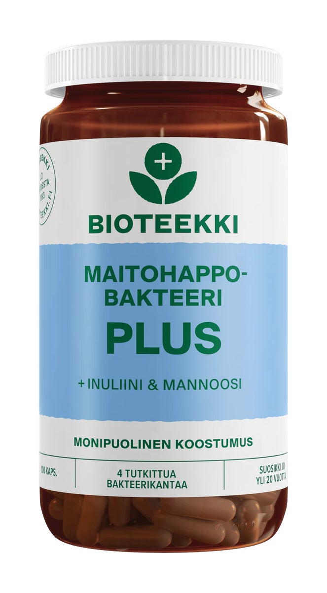 Sisältää neljä tutkittua, toisiaan tukevaa maitohappobakteerikantaa. Lisäksi siinä on bakteereiden hyvinvointia tukevia aineita. Maitohappobakteeri Plus sopii käytettäväksi päivittäin tai kuuriluontoisesti ja soveltuu koko perheelle.