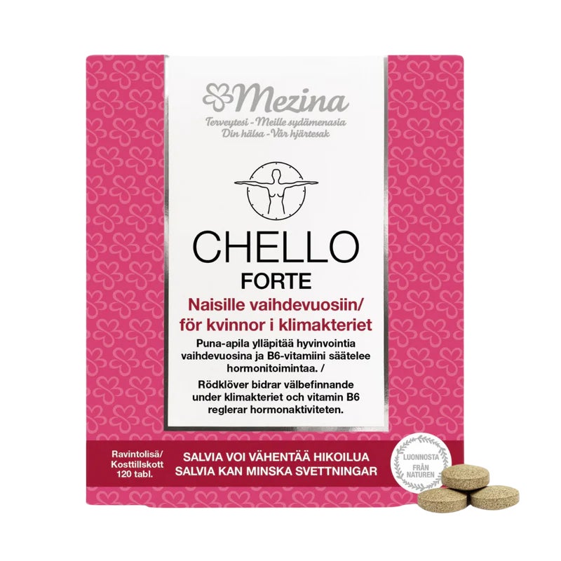 Chello Forte on luonnollinen ravintolisä, joka on suunniteltu erityisesti vaihdevuosien aikaiseen hyvinvointiin. Se sisältää salviaa, joka auttaa hillitsemään liiallista hikoilua, sekä puna-apilaa, joka tukee vaihdevuosien epämiellyttävien kuumien aaltojen ja levottomuuden lievittämistä.