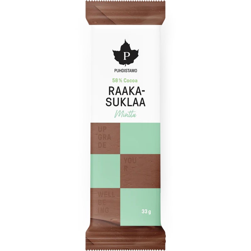 Ainesosat / Ingredienser: Luomu kaakaopapu, luomu ruokosokeri, luomu kaakaovoi, luomu piparminttuöljy / Ekologisk kakaoböna, ekologiskt rörsocker, ekologiskt kakaosmör, ekologisk pepparmyntolja